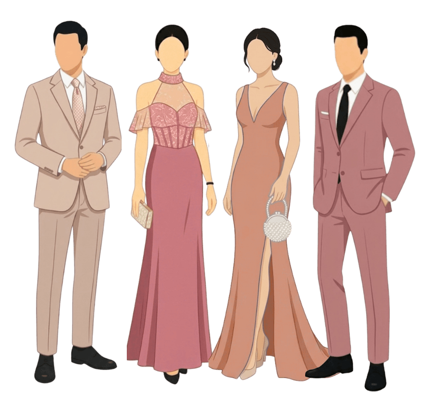 Strictly no floral dresses and white is reserved for the Bride.